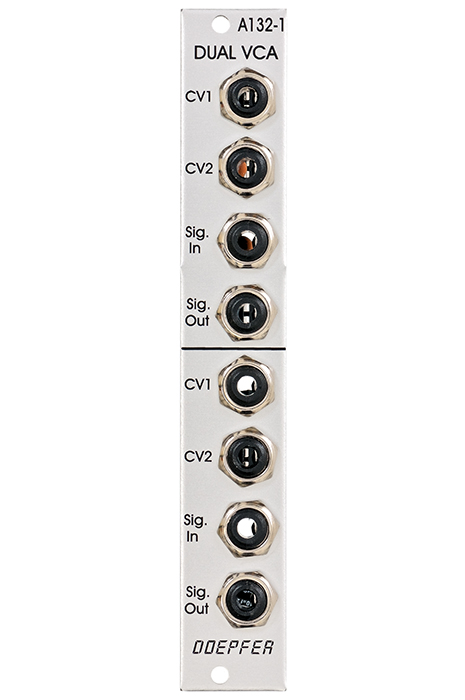 Module A-132-1 contains two voltage controlled amplifiers, with a linear response most suited to regulating the level of control voltages (ADSR amount, level of vibrato effect, etc.). In non-critical situations, though, its VCAs can be used to control audio signals. Amplification is governed by the sum of the voltages patched into the two CV inputs.