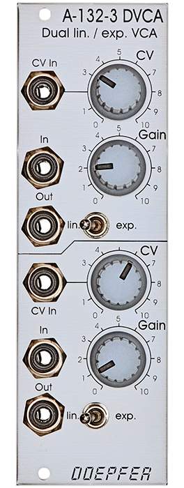 Module A-132-3 is composed of two identical voltage controlled amplifiers (VCA).
