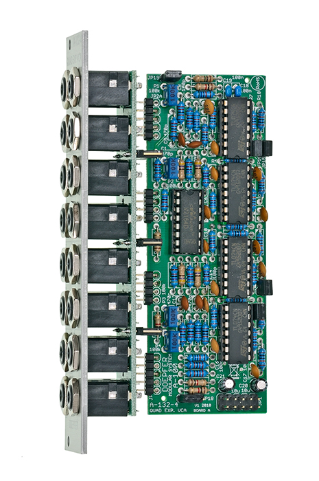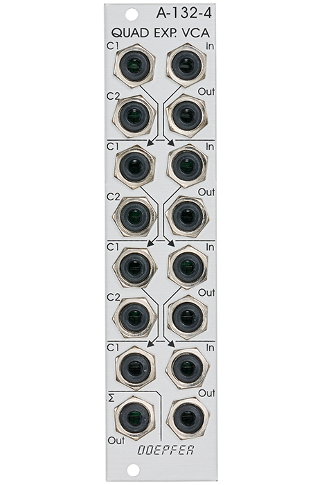 Module A-132-4 contains four identical voltage controlled amplifiers (VCA) with exponential control scales.