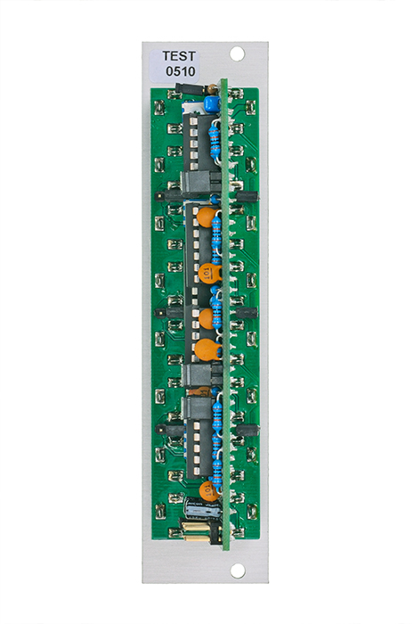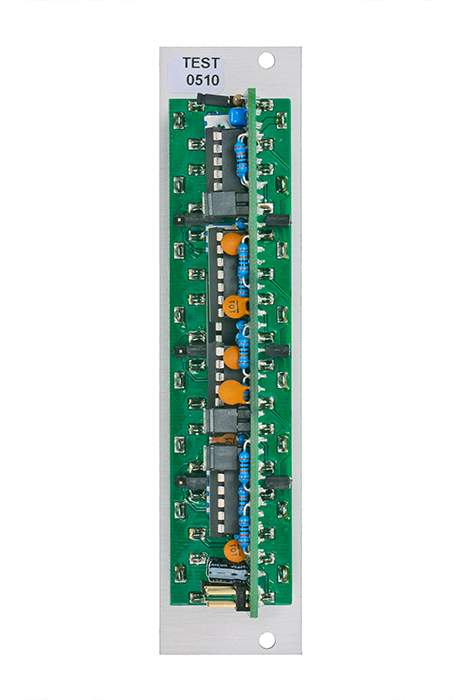 Each VCA has two control voltage inputs (C1, C2), a signal input (In) and a signal output (Out). The control voltage inputs C1 and the signal inputs can be normalled by means of internal jumpers, i.e. the corresponding input signals of unit #1 can be connected to the switching contacts of unit #2. Those of unit #2 can be normalled to unit #3 and those of unit #3 to unit #4. If the normalling is not desired the jumpers have to be removed. In addition the sum of all four outputs is available (bottom left socket with the sum sign). Therefore unit #4 has only one control voltage input (only C1, no C2). If desired this socket can be jumpered as control voltage input 2. But then the sum signal is no longer available as a socket (only as an internal pin). For each VCA output a jumper is available that determines if the output signal of the corresponding VCA is added to the sum signal. From the factory all four jumpers are set (i.e. all four VCA output signals are added). By removing of one or more of the jumpers one can choose which VCA output is added to the sum. The jumpers can be replaced by switches too.