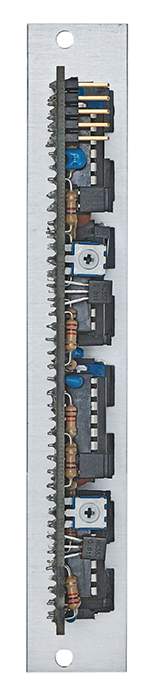 By setting a jumper you can determine if the module will react asymmetrically to positive CVs (eg. ADSR) or symetrically to bi-directional CVs (eg. LFO) Due to a normalled switching jack at CV input 1 you can also control the second crossfader with it.