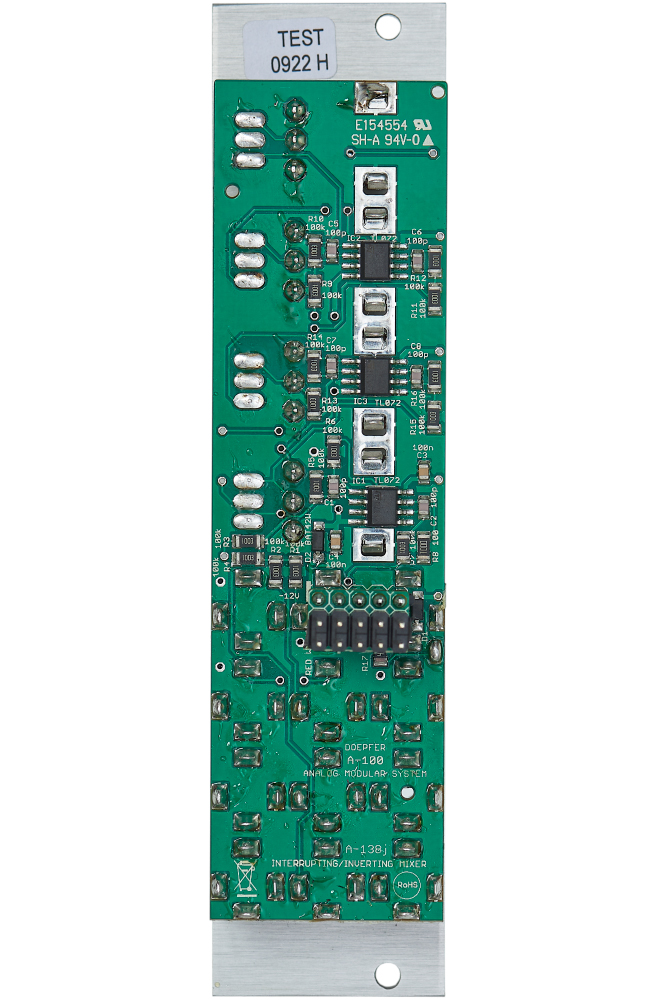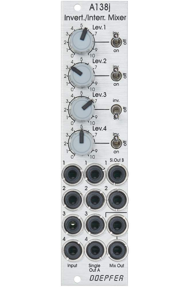 Module A-138j is a four channel mixer with an additional polarity/mute switch for each input. In the upper position of the corresponding switch the inverted signal is used. In the center position the input in question is turned off (mute) and in the lower position the "normal" (i.e. non-inverted) signal is used. The inverting of signals is used especially for control voltage signals (e.g. LFO, ADSR). But even for corellated audio signals this feature is useful. For example for feedback applications or the mixing of original and processed signals (e.g. original and filtered signal to obtain new filter types).