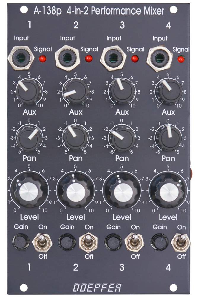 The module A-138p is the 4-fold input module while A-138o is the output module that can be combined with one or more A-138p's, resulting in a mixer with four, eight, twelve or even more inputs.