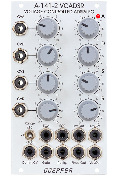 Compared to the A-141 a lot of improvements and expansions have been added: common control voltage input for all time parameters (A/D/R), range switch for three different time ranges, inverted ADSR output, additional output with voltage controlled level (i.e. built in output VCA), digital outputs for End of Attack (EOA) and End of Release (EOR), EOR is e.g. required for the VCLFO mode.