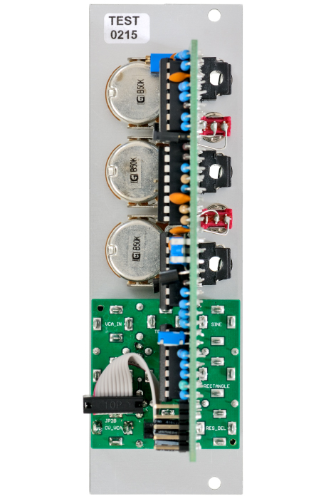 The voltage controlled LFO has the waveforms Triangle, Sine, Sawtooth and Rectangle available and features a Reset/Sync input. Triangle/Sine and Rectangle are displayed by means of dual-color LEDs. The CV control can be switched to attenuator or polarizer. The frequency range (without external CV) is from about 0,005 Hz (i.e. about 3 minutes) to 200 Hz. In addition an ultra-low mode (up to 1 hour) can be activated by means of an internal jumper. The linear VCA can be switched to "normal" VCA or voltage controlled polarizer.