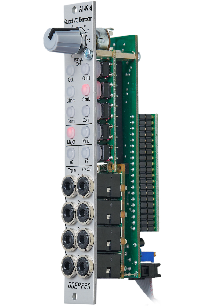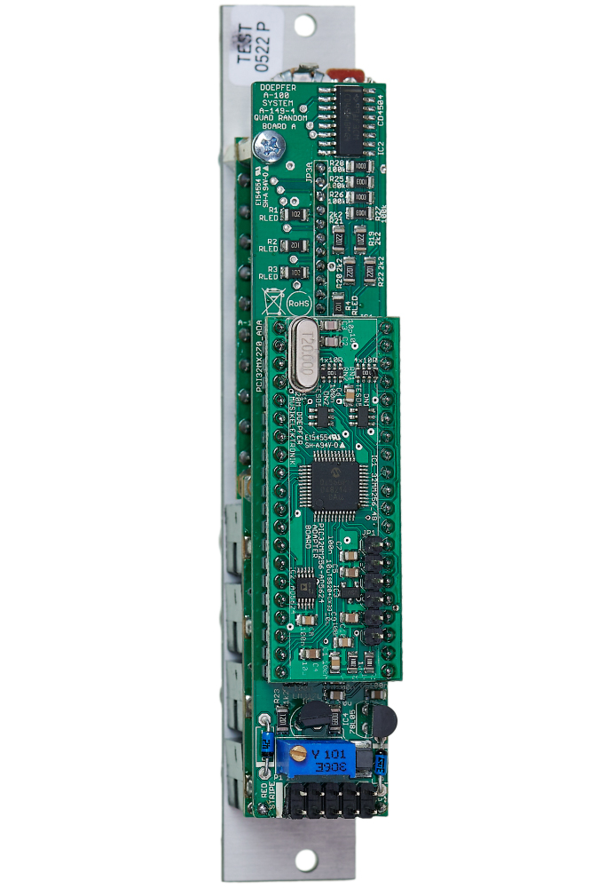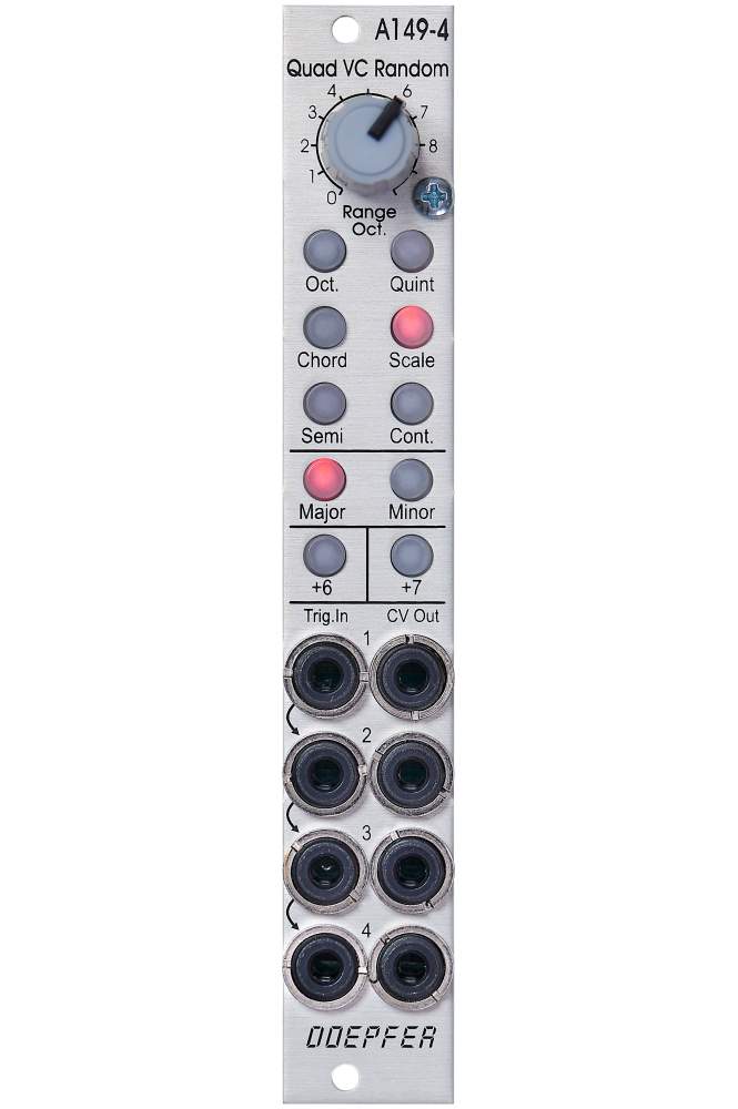 Module A-149-4 generates four triggered random voltages which meet the criteria choosen by several controls and associated control voltage inputs.