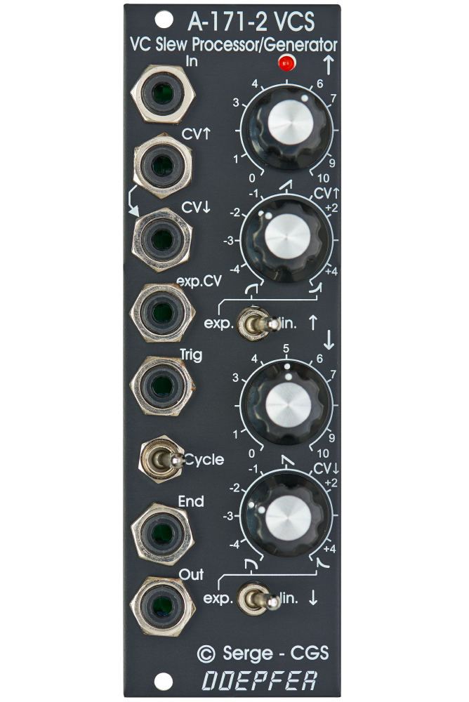 Much more than just a plain slew limiter the A-171-2 is a multi-functional module for generating and processing control voltages and audio signals in the manner of a function generator. LFO, envelope generator, slew limiter... plenty functions are possible!
