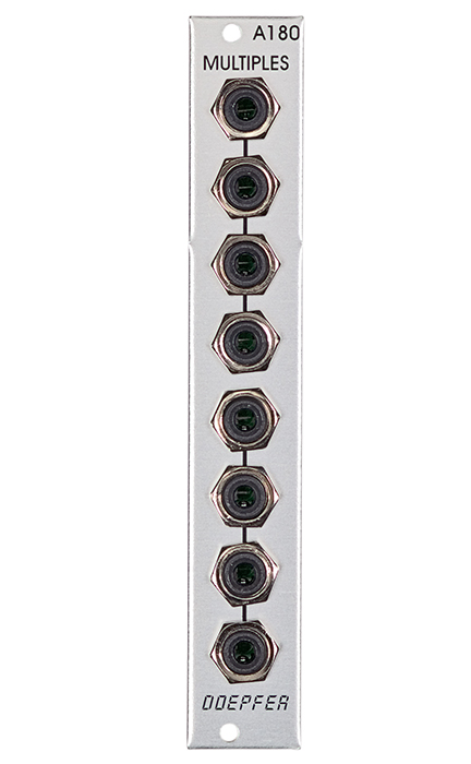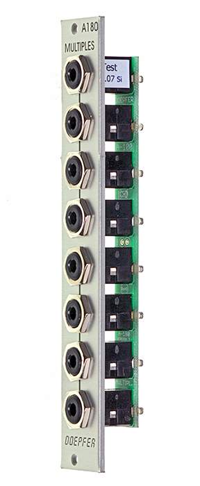 It has eight inter-connected sockets, so that you can patch more inputs or outputs into any module. The sockets are split into two groups of four. If an 8-fold multiple is required a bridge has to be soldered at the pc board. Even though the A-180-1 is a very "primitive" low-level module it is required very often. Within a big A-100 system sufficient multiples should be planned.