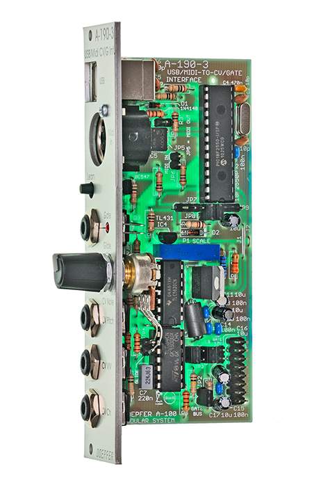 - By means of two jumpers CV1 and Gate can be connected to the corresponding lines of the A-100 bus. That way the VCOs A-110 or A-111 and the envelope generator A-140 can be controlled directly via the A-100 bus, i.e. it's not necessary to patch CV and Gate with cables between the front panels. In addition CV1 is buffered, i.e. even several VCOs can be controlled by the A-190-3 without the need of an additional bus buffer (e.g. A-185-1 or A-185-2)