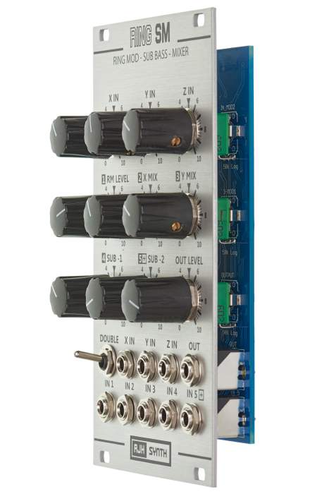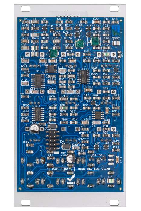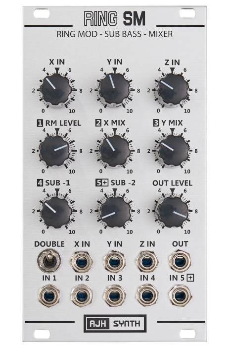 The AJH Synth Ring SM is a unique new Eurorack module that features a three input discrete transistor Ring Modulator core, two shaped sine Sub Bass generators and a five channel discrete transistor mixer with extra distortion capability; all within 14HP of Eurorack Modular panel space.