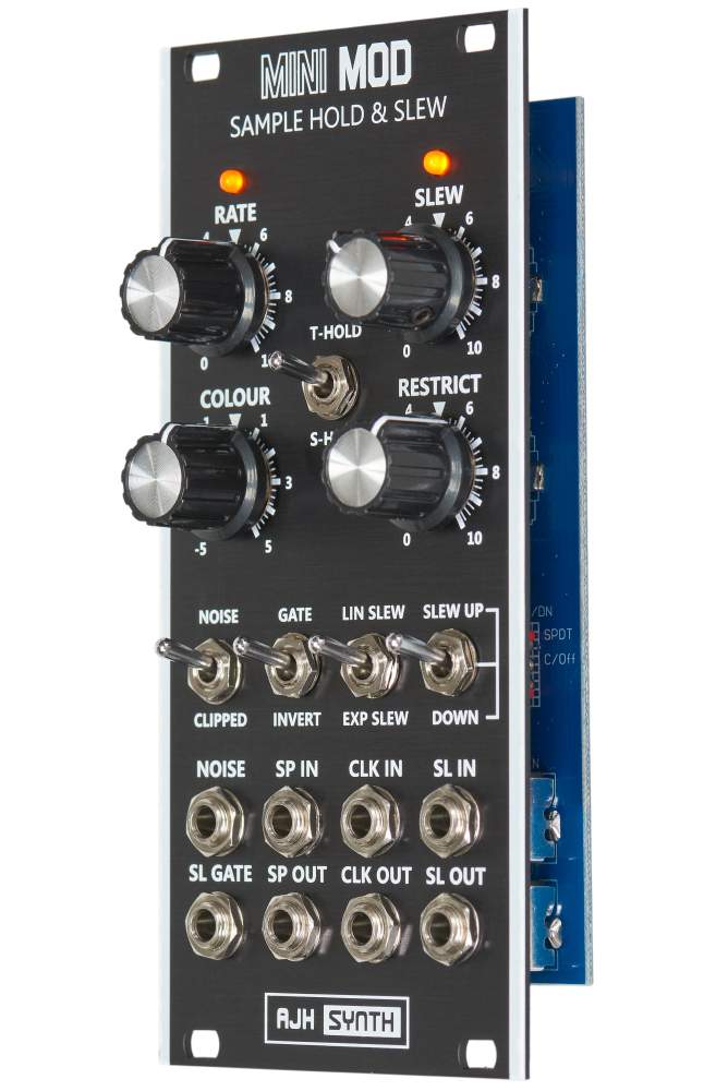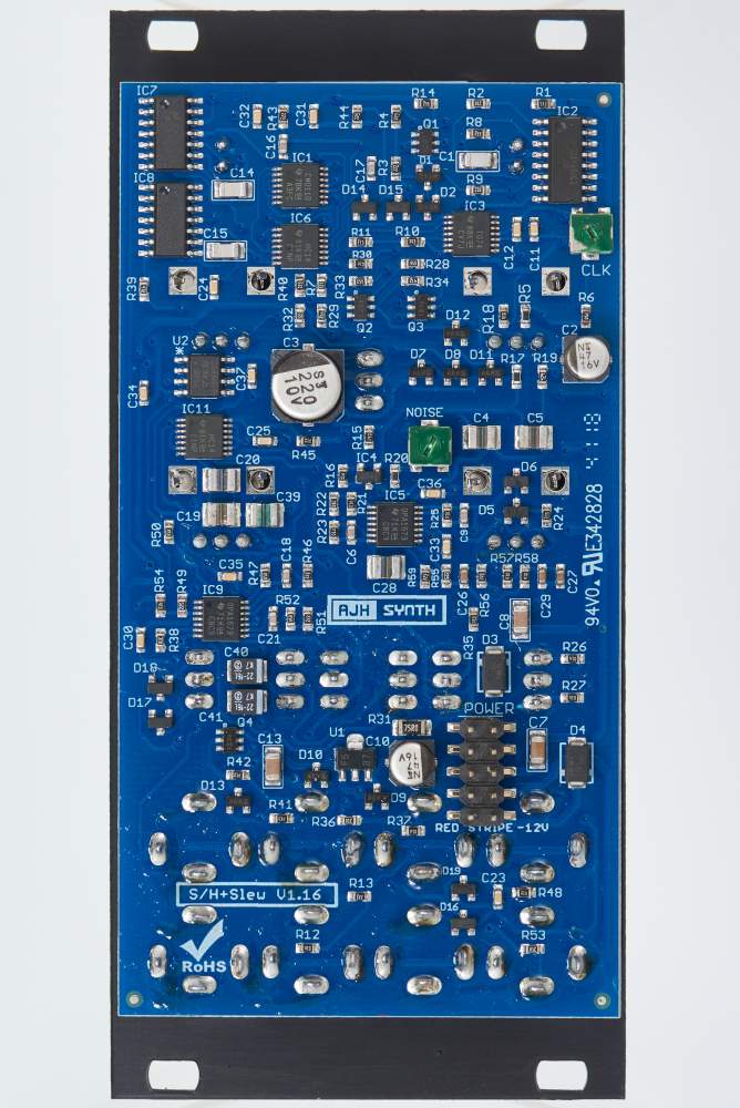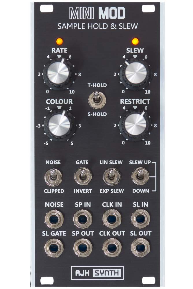 Sample Hold & Slew from AJH Synth features a versatile Sample and Hold circuit designed by Tony Allgood, built under license from Oakley Sound. It can be clocked from an external source or by the inbuilt clock generator, whose speed rate can be monitored by an LED.
