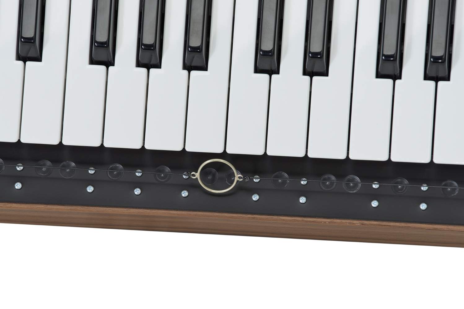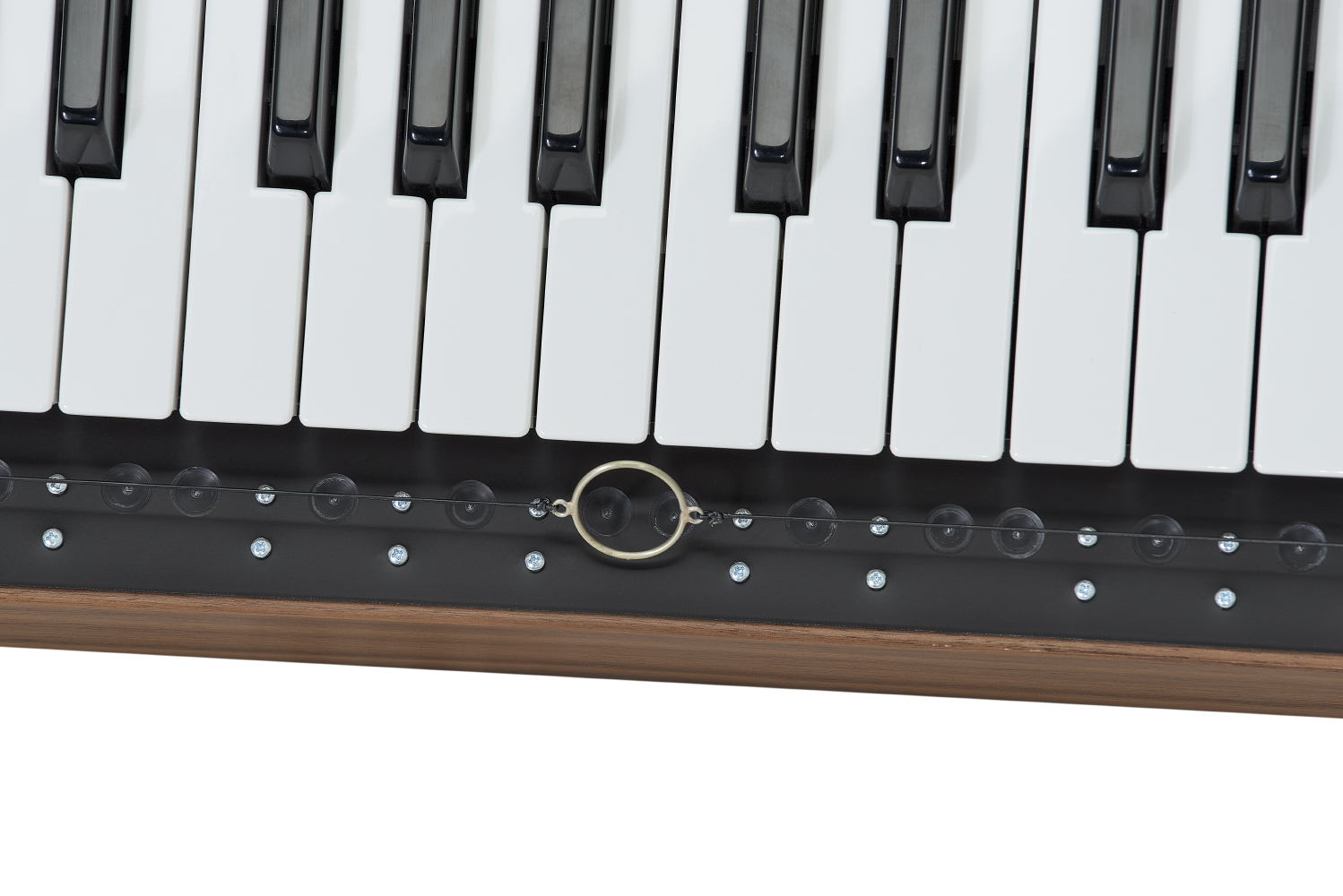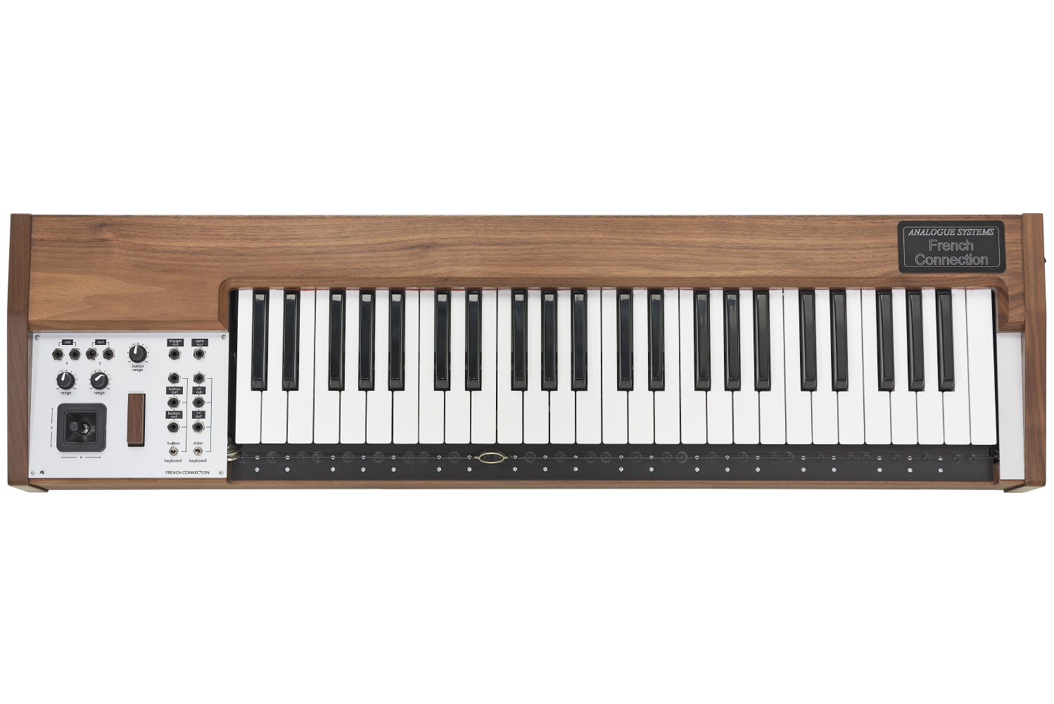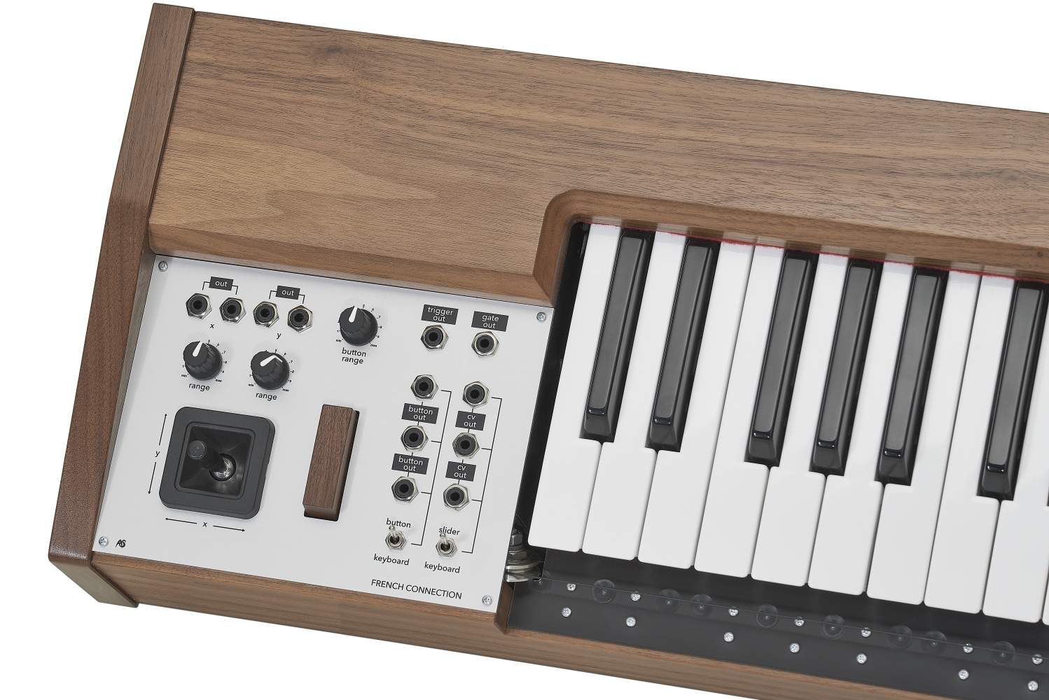 By placing a finger through the ring suspended below the physical keyboard, the player can glide smoothly between notes by moving the playing hand from left to right, creating a very natural vibrato in the process, while a pressure resistant wooden button offers great control of the amplitude. A VCO and VCA is basically all it takes to recreate a sound similar to the Ondes Martenot. But of course the CVs the Fench Connection is supplying can be routed to any other parameter in a modular synthesizer as well.