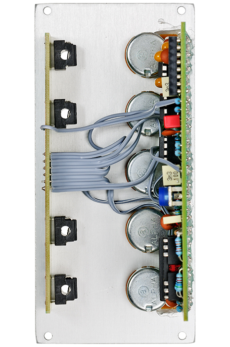The module is based on a bucket brigade device with six parallel delay taps. Those six delay times have no relationship to each other and their outputs have different levels. You have to consider the chorus/reverb effect as a mixture of six different short delays what results in a dense sound. The clock frequency which scans the bucket brigade is audible and you´ll have to use a low pass filter in order to eliminate or minimize it. The delay time can be set with the according control between 2.5ms and 150ms. CV control gives you much shorter / longer delay times. The resonance has to be considered as the delay´s feedback parameter and it can go up to self-oscillation. The dry / wet relation can be controlled manually and with a CV.