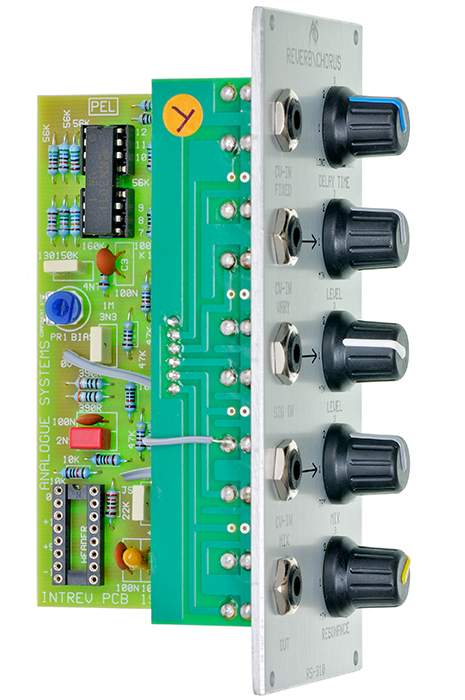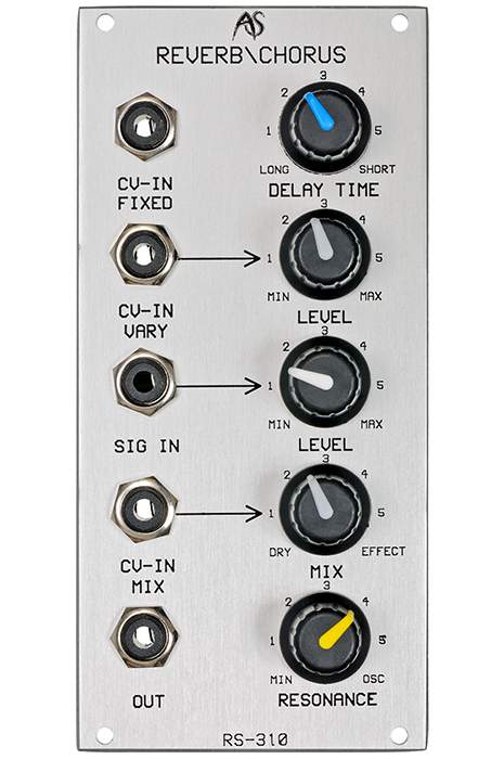 RS-310 is a Reverb/Chorus module with voltage control of dry / wet mix and the delay time. It creates flanger and chorus effects but also short echos and reverbs.