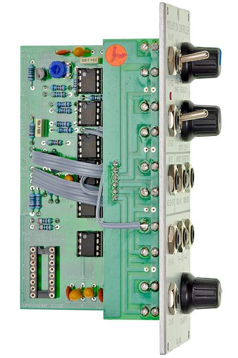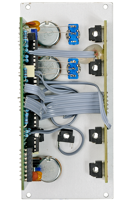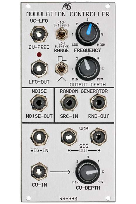 This very useful module combines in 12HP four completely different sub modules: a voltage controlled LFO, a noise generator, a sample-and-hold type random generator and a VCA.