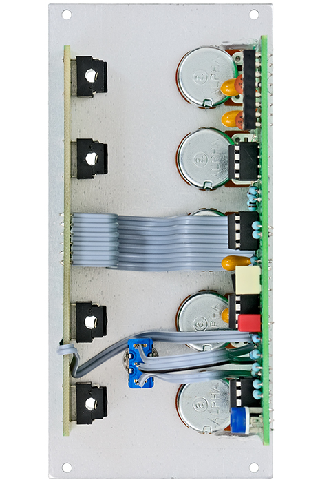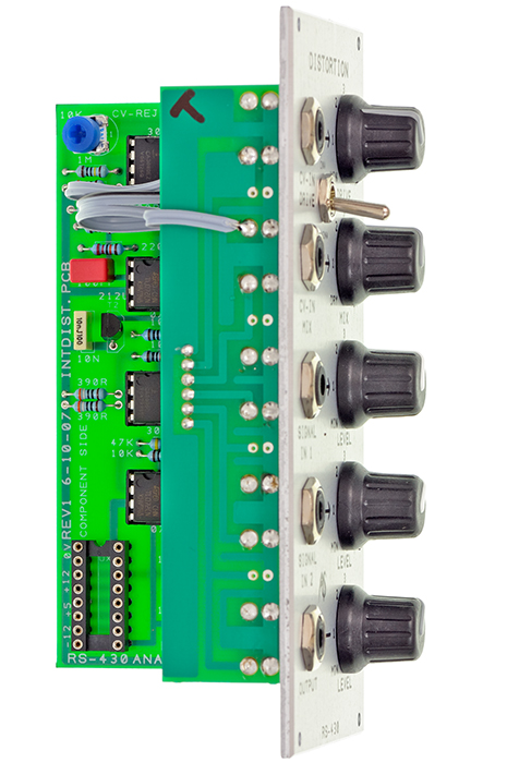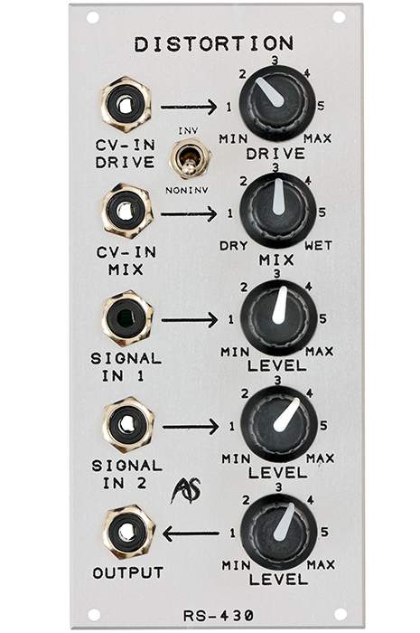 The module is optimised to high level in a modular systems but you can process guitar signals as well. Two CV inputs make it possible to modulate not only the amount of distortion but also the dry/wet-relation. The mix of both audio signals at the input is being split and sent to two signal paths: the unprocessed, clean path and the one distiortion ciruitry. The switch labeled INV/NON-INV betermines if the distorted signal has the same phase as the original signal or if it´s phase inverted, an aspect that can change the timbre. If you´d like to use the module before a filter module in order to filter two oscillators, the two audio inputs come handy as you cyn leave out an additional mixer module. But the RS-430 can be used anywhere in the signal path of course.