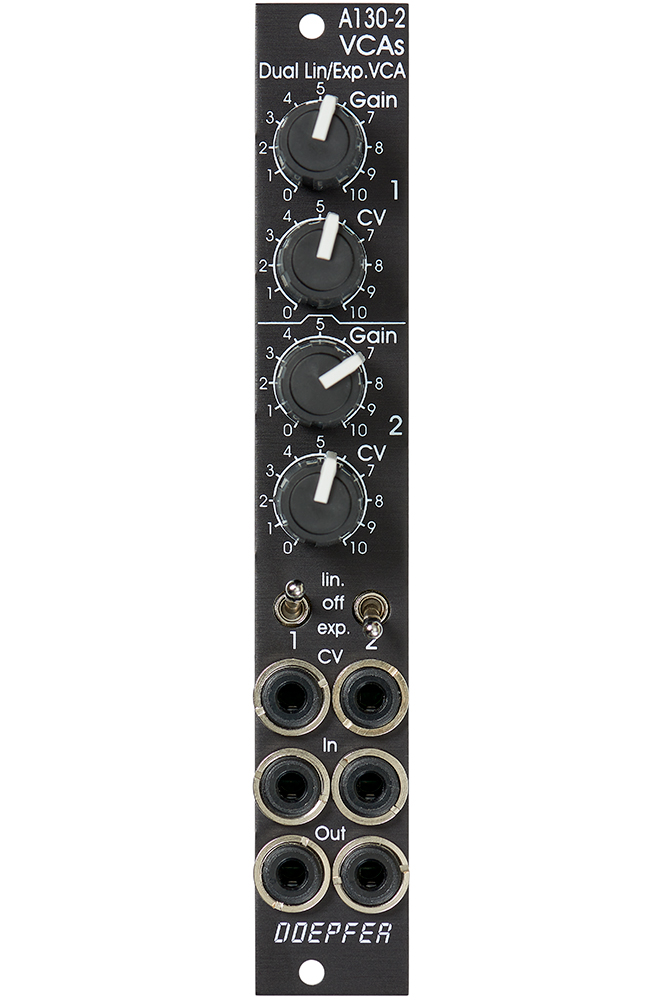Module A-130-2v is composed of two identical voltage controlled amplifiers (VCA). Each VCA has a manual gain control (also named Initial Gain) and a control voltage input with attenuator. The character of the control scale can be switched to linear or exponential. All inputs and outputs are DC coupled. Consequently the VCAs can be used to process both audio and control voltages (e.g. for voltage control of the level of LFO or envelope signals). The signal input has no attenuator available but is capable to process up to 16Vpp signals (i.e. -8V...+8V) without distortion. For the processing of higher levels an external attenuator (e.g. A-183-1) is recommended.