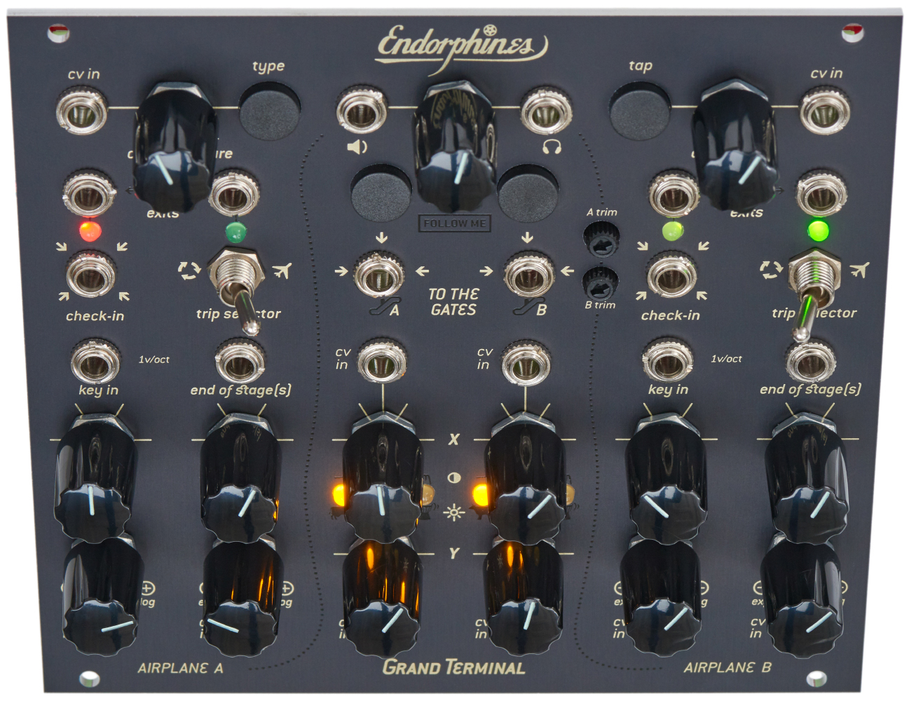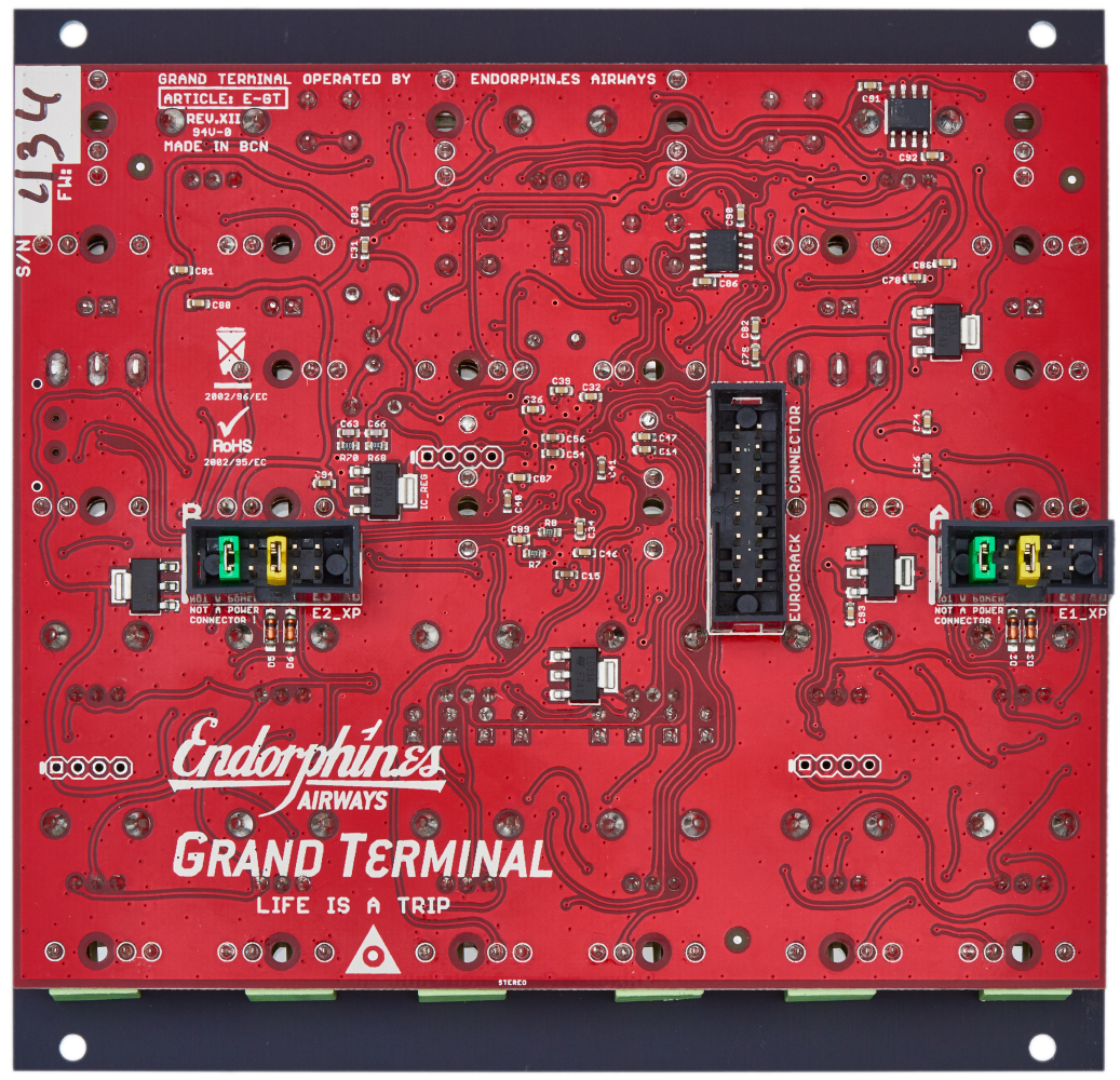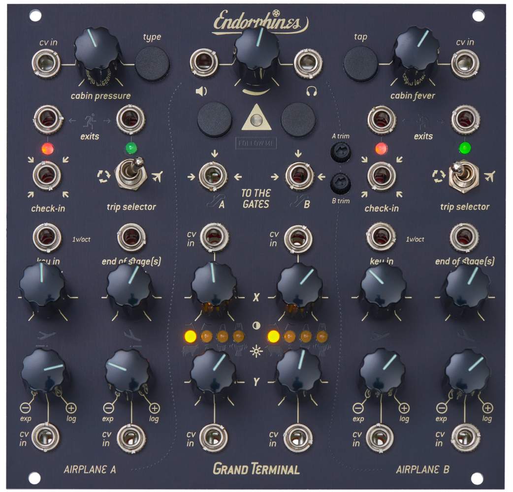 The Grand Terminal is a digital multipurpose module. Its two function generators can be used as envelopes, LFOs or VCOs. The 2 filter channels individually offer 8 modes of operation, and combined with its mixing and routing capabilities and a multi effects unit, it is not only a complete back end of a synth voice, but can also be used as a synthesizer voice, stereo filter bank or general purpose sound effects processor.