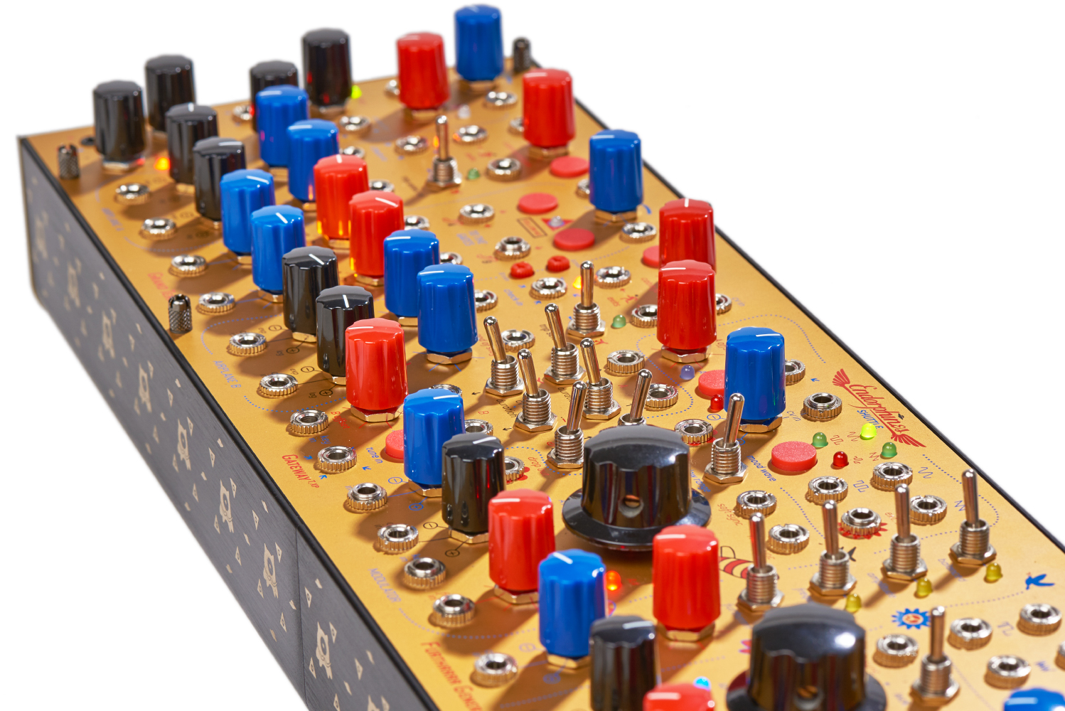 The synthesizer is composed of two Buchla style oscillators plus Waveshaper, two function generators, which can be used as envelopes, LFOs or additional VCOs, two filters respectively low pass gates with eight modes of operation and an effects processor.
