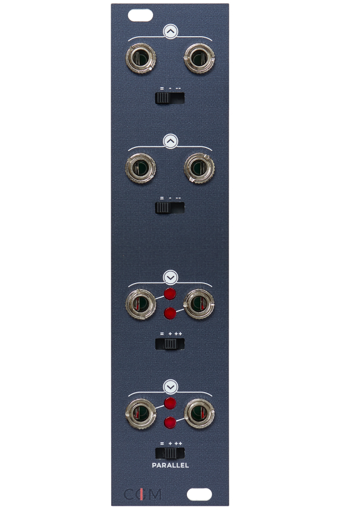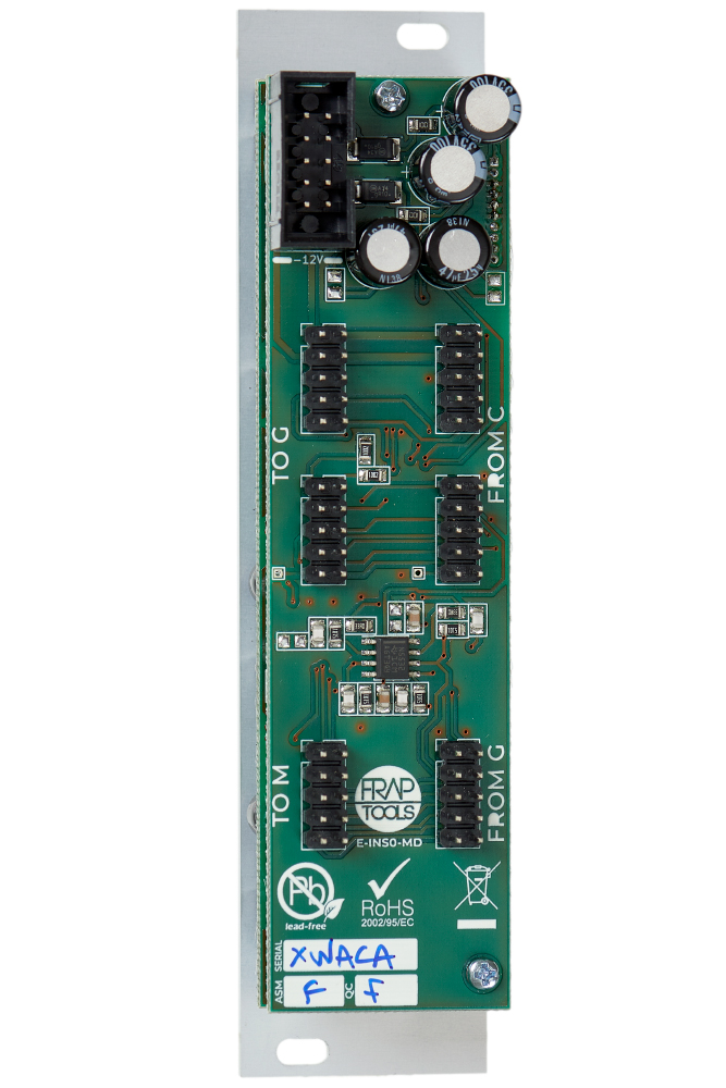 The Fraptools CGM Insert module allows you to add stereo effects to the CGM mixer series, either by inserting them between two points on the internal summing bus, or by placing them in parallel, like a rudimentary stereo send and return.