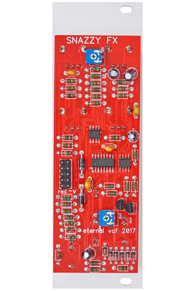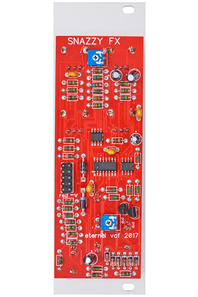 The module comes equipped with an AC-coupled audio input. The following drive circuit is able to boost incoming signals considerably. Its results range from light saturation to harsh distortion. The filter section features cutoff and resonance potentiometers. In addition, there is a CV input with attenuator and a phase inverted FM input. Drive and resonance parameters influence each other. The lack of temperature compensation causes musical instabilities.
