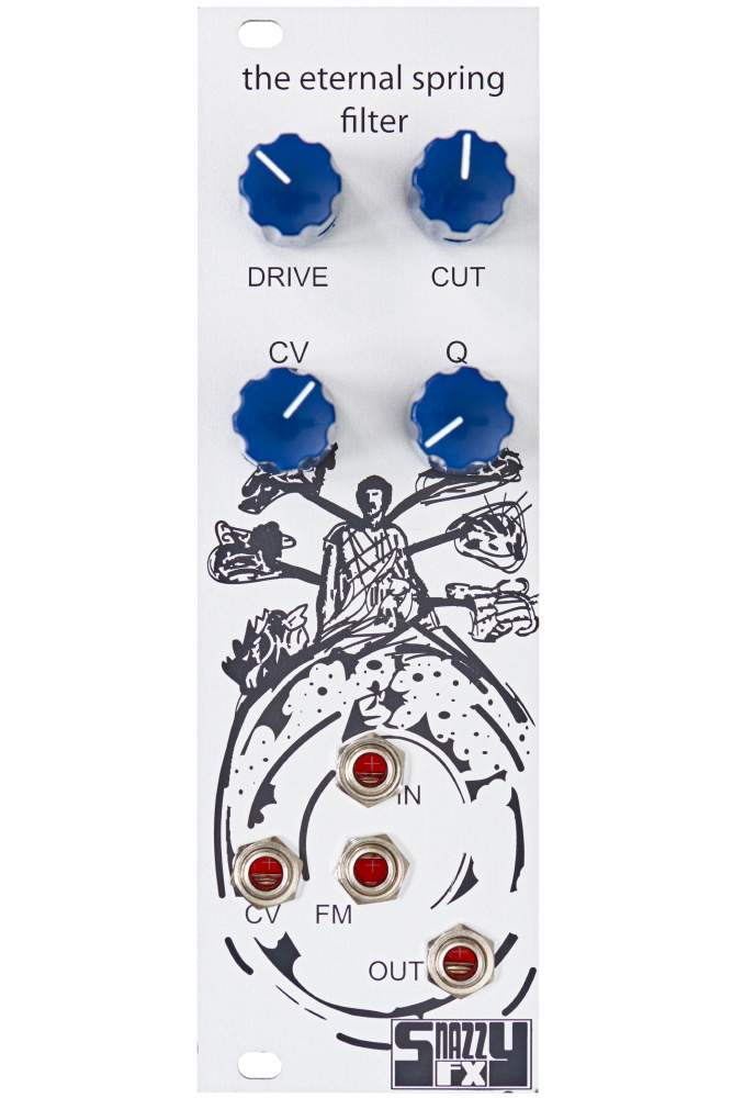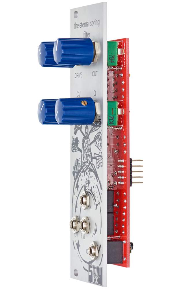 Eternal Spring is a low-pass filter with personality. Depending on its drive and resonance settings, the circuit can add a little bit of saturation, a good amount of dirt or heavy distortion to incoming audio material. Occasionally, users will feel reminiscent of a wavefolder. The cutoff potentiometer means business. The resonance ranges up to beefy self-oscillation. However, thanks to the gain stages acting like a natural limiter, the circuit won’t squeal all too loud. – Therefore, musicians can boldly reach for all controls. A FM input allows wild modulations in the audio range. Temperature compensation was deliberately omitted in order to give the Eternal Spring a more lively character.