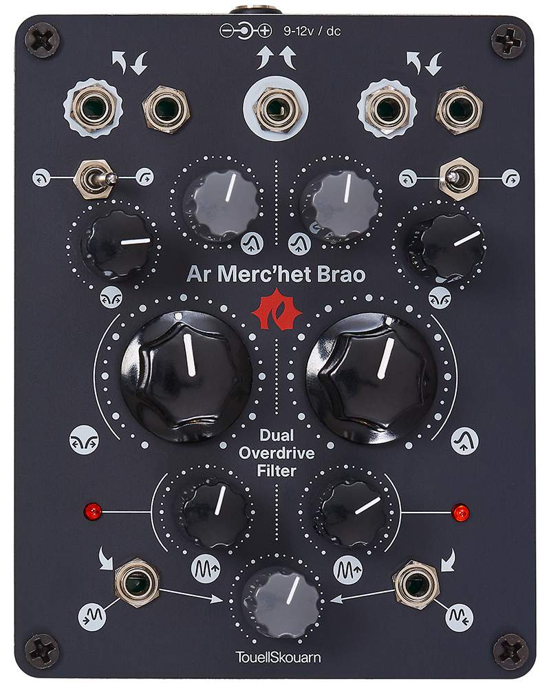 The filters are resonant with a slope of -12dB. A switch allows to switch each filter from LowPass to HighPass. The filter cutoffs are voltage controlled thanks to dedicated CV inputs. Additionnaly the Ar Merc’het Brao features global controls for cutoff and resonance.