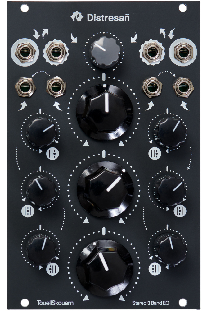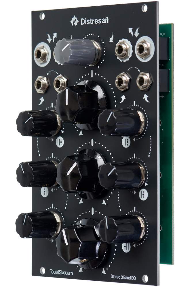 Distresañ, a stereo 3-band EQ which enables DJ-style effects and is geared towards quick hands-on manipulation and CV manipulation of its bands. Distresañ is a Dual Cut/Boost EQ!
