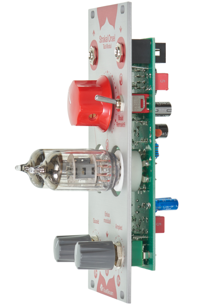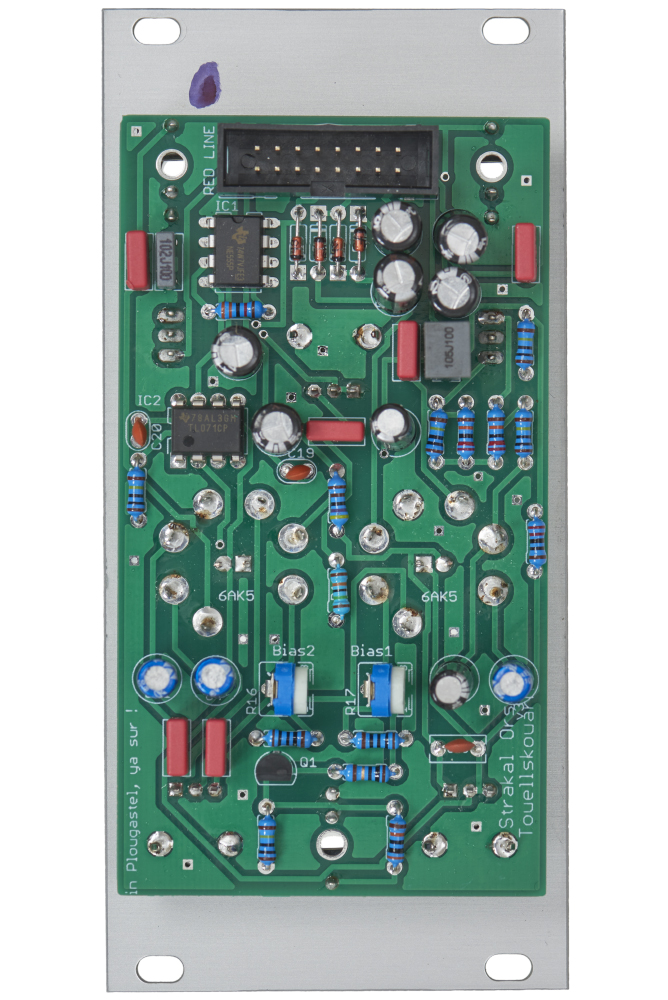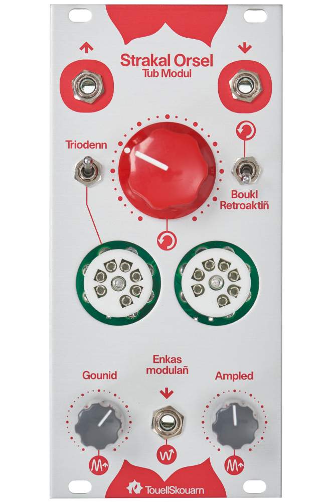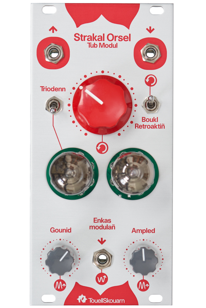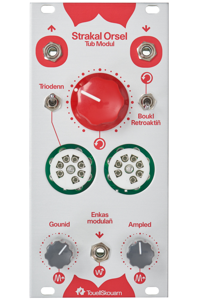 Strakal Orsel is a powerful, hand-wired tube distortion module. As known from other Touell Skouarn circuits, all sockets and control elements have Breton names. (Except for the audio input and output, which are marked with arrows.)