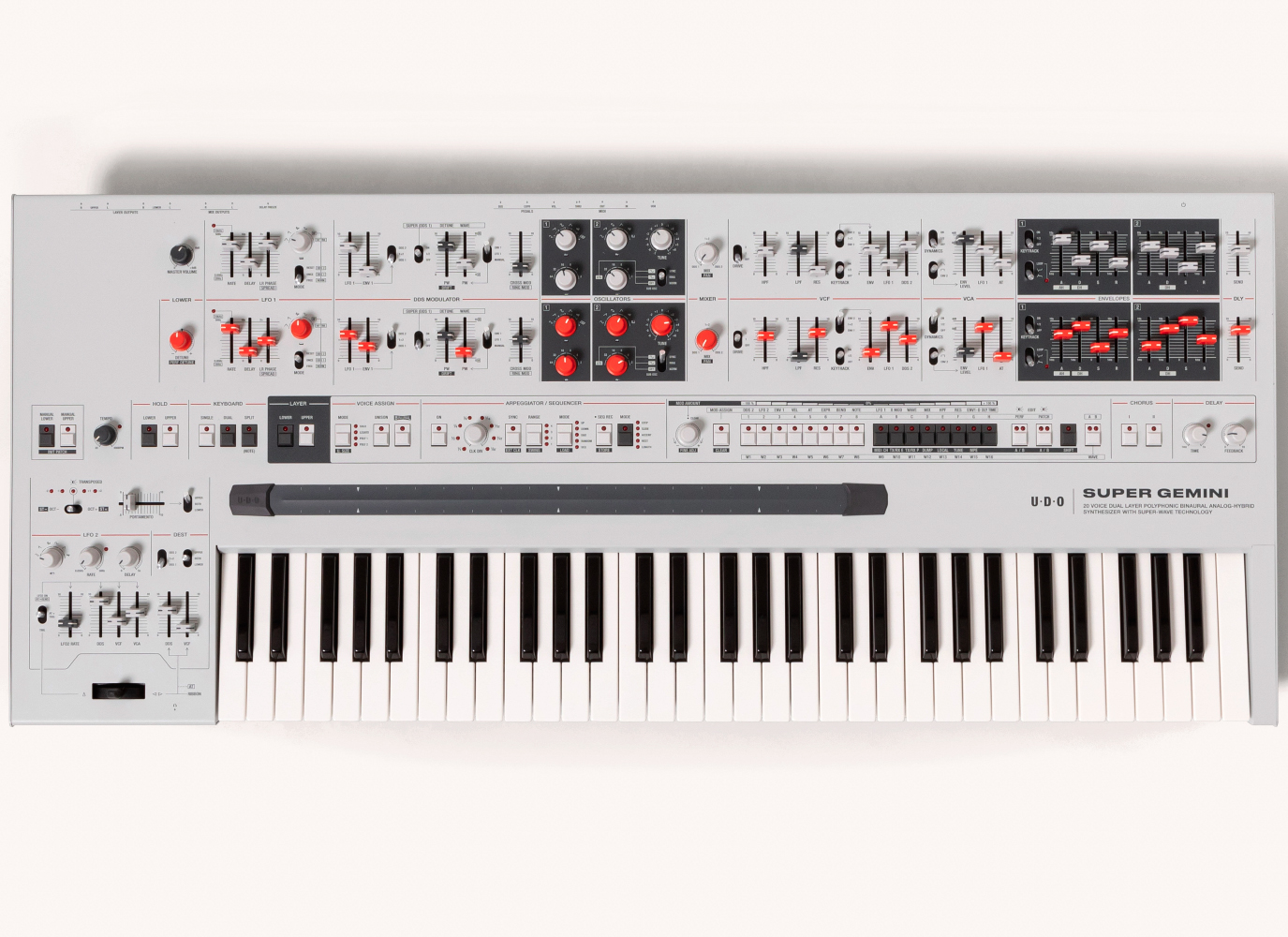 The Super Gemini is a 20-voice polyphonic, bi-timbral analog-hybrid synthesizer. Employing an unprecedented dual-layer design, the Super Gemini gifts you with immediate comprehensive control over both timbral layers — allowing you to tweak, mold and bend your performances on a synth with unparalleled sonic possibilities.