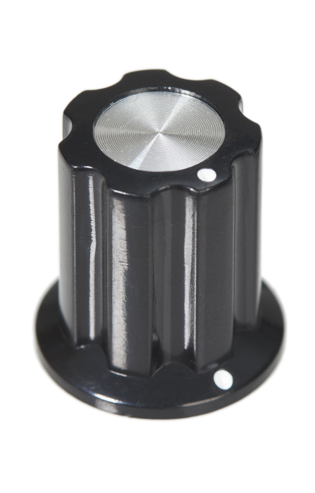 Glossy black knob with silver-metallic coverplate and two white dots, diameter 15/12 mm bottom/top, height 16 mm, for 6 mm axis with 18 teeth (spare part for A-100, is used in the vintage versions of the A-100 modules)