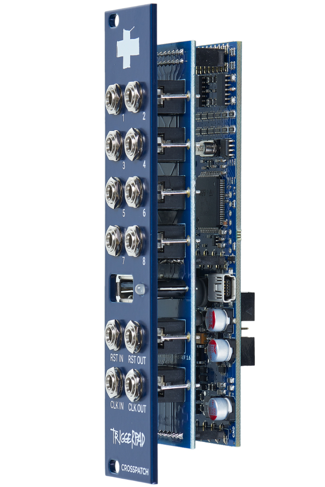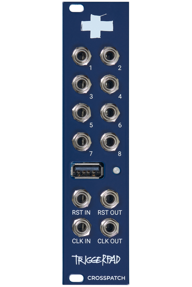 The Triggerpad turns USB Midi controllers with an 8x8 grid into a trigger/gate sequencer. The controller is connected to the module via a USB cable and offers the ability to create and save patterns. The step length can be set individually for each channel from 1-64. This makes it possible to create polyrythmic sequences.