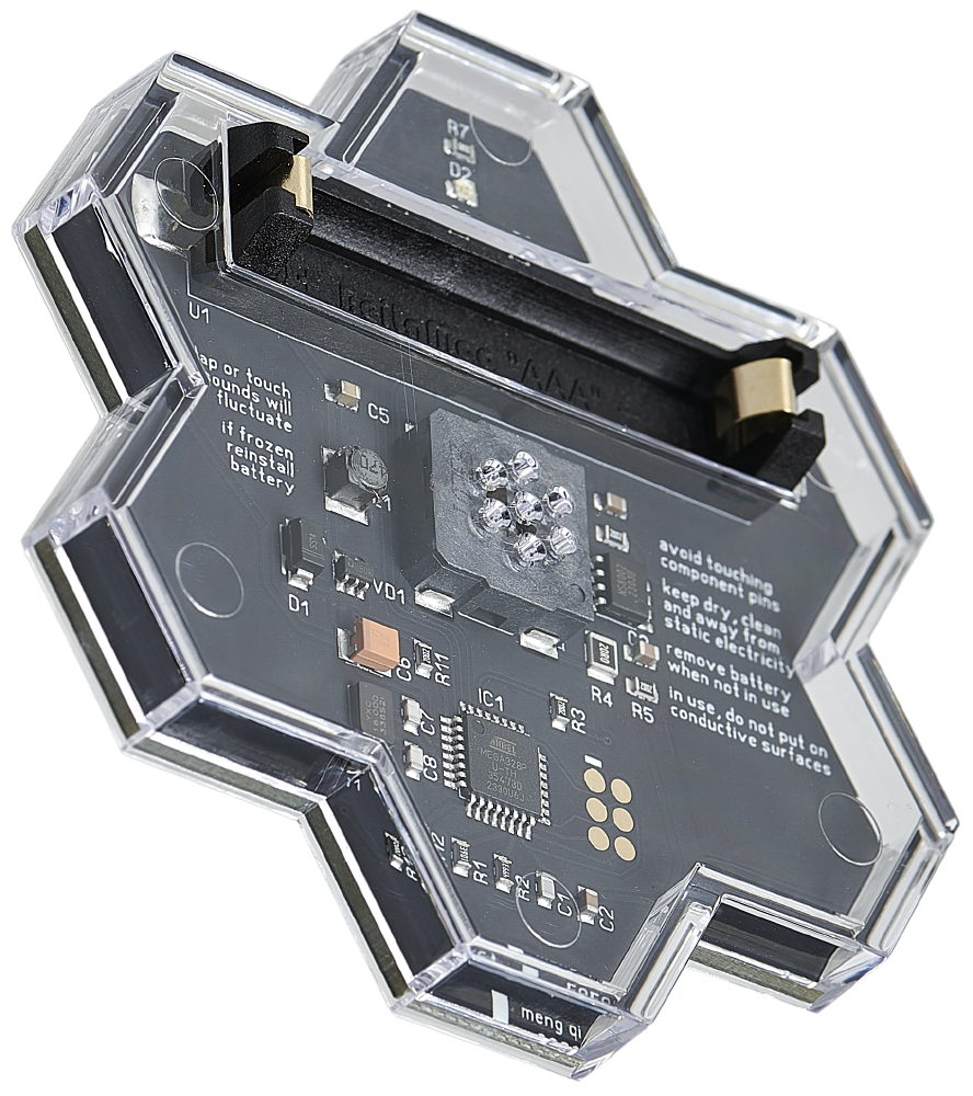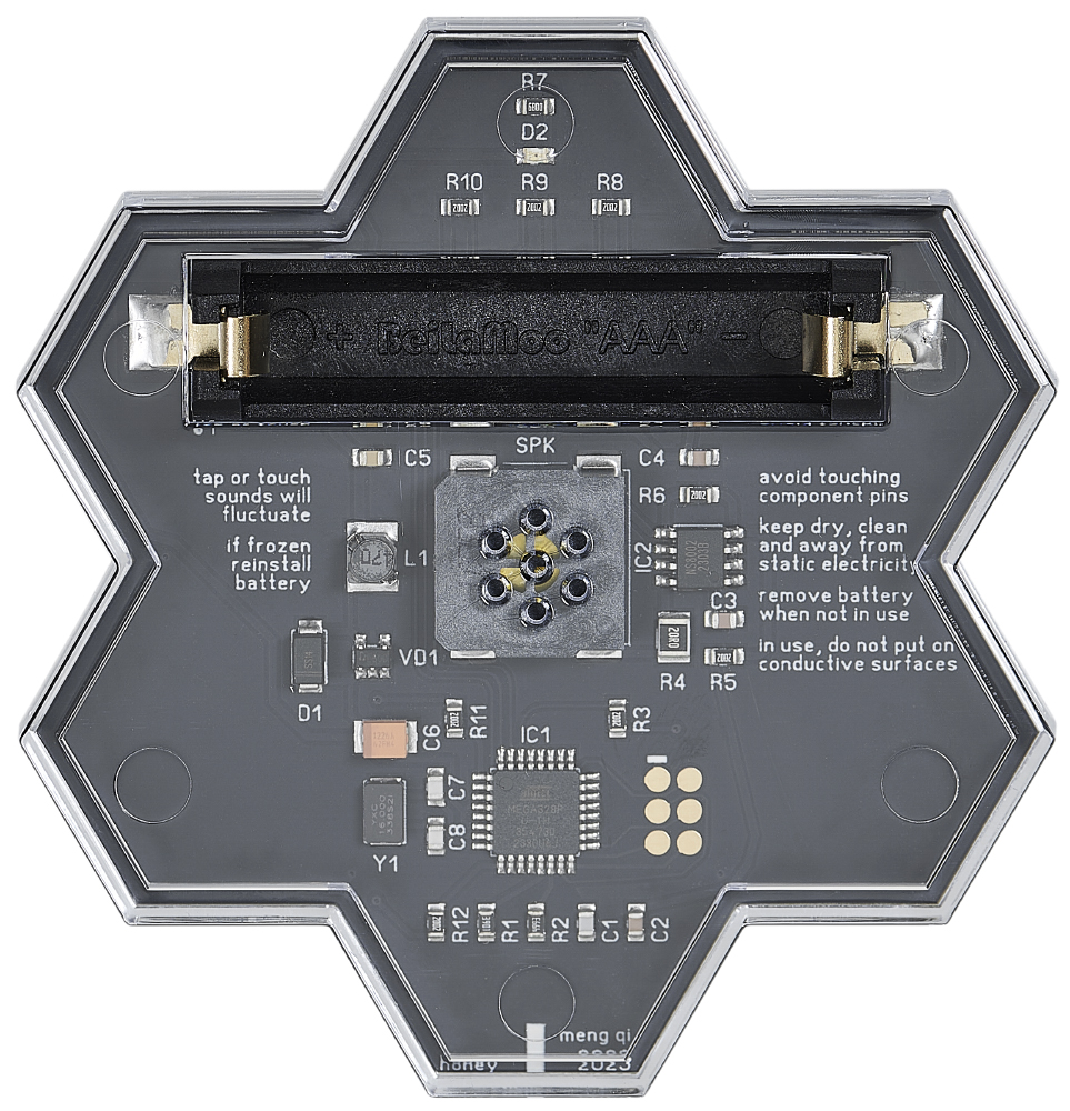 Honey is a palm-sized, touch-based noise instrument based on the bytebeat principle. It runs on a single AAA battery and emits sound through a speaker. It doesn't have an audio jack. It creates dynamic sounds by manipulating variables and mathematical operations through touch.